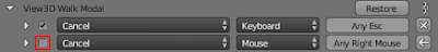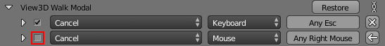 Now to make Blender save the position when releasing the mouse butotn, we have to bind it to the Confirmaction. In the 3D View → View3D Walk Modal section, add a new input binding by clicking the + Add New button